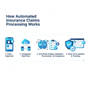 Automated claims processing follows a connected workflow that begins the moment a claim is reported. Data flows through integrated systems rather than being passed manually between departments. Rules engines, artificial intelligence and validation checks guide each step, ensuring consistency and compliance.